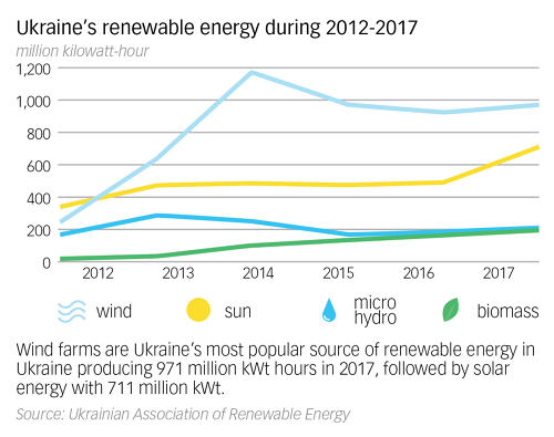 同樣,烏克蘭的可再生能源部門發展迅速:根據烏克蘭可再生能源協會的數據,從2012年到2017年,可再生能源產量翻了三番。