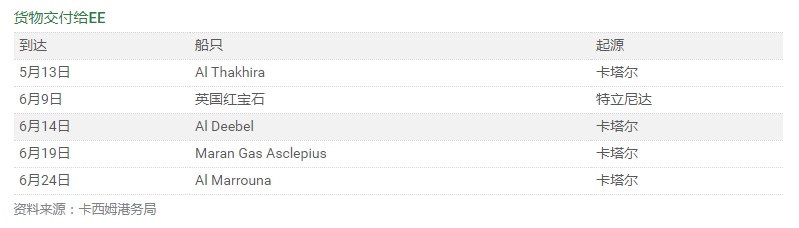 交付給EE終端的五種貨物中有四種是從卡塔爾運來的,另一種是從特立尼達和多巴哥運來的,發貨人被列為Gas Natural。