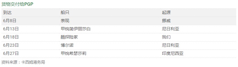 巴基斯坦于5月在旁遮普地區的Haveli Bahadur Shah和Bhikki完成了兩座燃氣發電廠的投產。這產生了對六種液化天然氣貨物的充足需求,這些貨物已交付給PGP終端。位于旁遮普邦的Balloki的第三座發電廠預計將在未來幾個月內啟動。這將為電網增加約3.6 GW的新容量,并有助于減少停電的可能性。