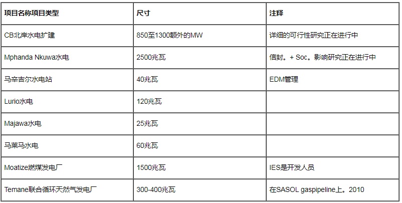兩個直接項目是Cahora Bassa大壩和有爭議的Mphanda Nkuwa大壩(2500兆瓦)的850兆瓦(名義)擴建。見下表。