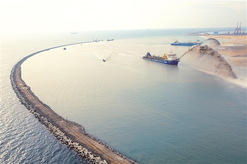科倫坡港口城項目是中國與斯里蘭卡在“一帶一路”建設中的重點合作項目,由斯里蘭卡政府和中國港灣科倫坡港口城有限責任公司聯合開發,于2014年9月動工,整體開發時間約25年。圖為吹沙船在科倫坡港口城項目上進行疏浚吹填作業。(圖片來源:新華社)